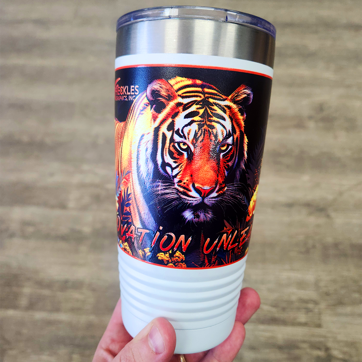 For our 360° cylindrical printer, I created artwork specifically for full wraparound prints. I didn’t operate the machine directly, but I focused on building seamless layouts, clean edges, and graphics that stayed clear from every viewing angle. Designing for curvature and distortion was a key part of the process.